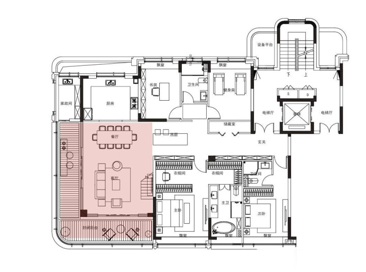 他们把建筑面积约351㎡顶复户型的电梯厅,设计成了私属领地。宽敞的「客餐厨LDK一体化设计」的大横厅,比别处更动人,因为它还拥有「L型阳台」。L型阳台的浓烈场景感,不是传统横向阳台所能比拟的——